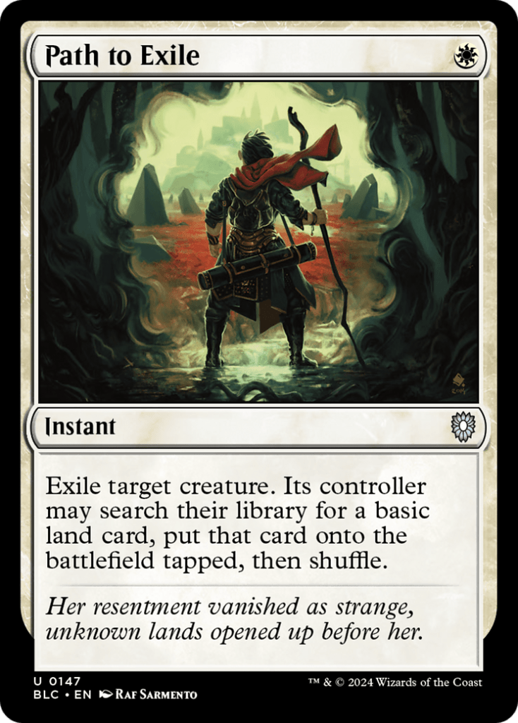 Path to Exile is staple removal in white at this point since it exiles a creature and then its controller may search their library for a basic land and put it onto the battlefield tapped, then shuffle. It also stands to reason that this also works well if it is the spell that we copy with Shiko and Narset to exile two problematic creatures.