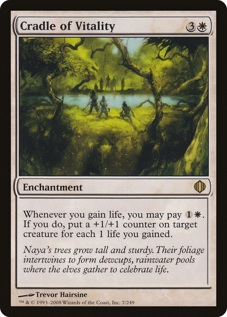 Cradle of Vitality is massive for us because whenever we gain life, we can pay one and a white to put a +1/+1 counter on target creature for each 1 life we gained, which after a couple of turns attacking with Garnet should net us a good number of +1/+1 counters from the life she gains us.