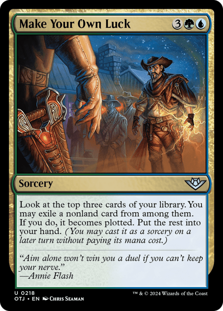 Make Your Own Luck is a solid card that let’s us look at the top three cards of our library and exiles a nonland card from among them and if we do that spell becomes plotted while putting the rest into our hand. This can also help us set us up to get a permanent into our hand that we can get for free from the plotted spell.