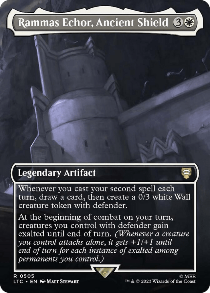 Rammas Echor, Ancient Shield is a very interesting card in that whenever we cast our second spell each turn we draw a card and make an 0/3 Wall with defender, which is pretty good. However the more important part of the card is that at the beginning of combat on our turn creatures we control with defender gain Exalted until end of turn.