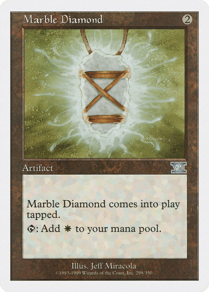 My pick for land is Crystal Vein, and my picks for artifacts are Marble Diamond, Sky Diamond, Charcoal Diamond, Fire Diamond, Moss Diamond, Grinning Totem, Phyrexian Vault, Teferi’s Puzzle Box, and Wand of Denial.