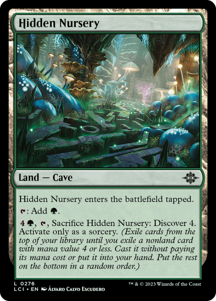 There are also additional ways to cast spells if we just so happen to be empty handed that are harder to interact with. I have found that the Discover lands from The Lost Caverns of Ixalan like Hidden Nursery to be solid backup plans to cast at least one additional spell, especially since a majority of our deck has mana value less than or equal to 4.