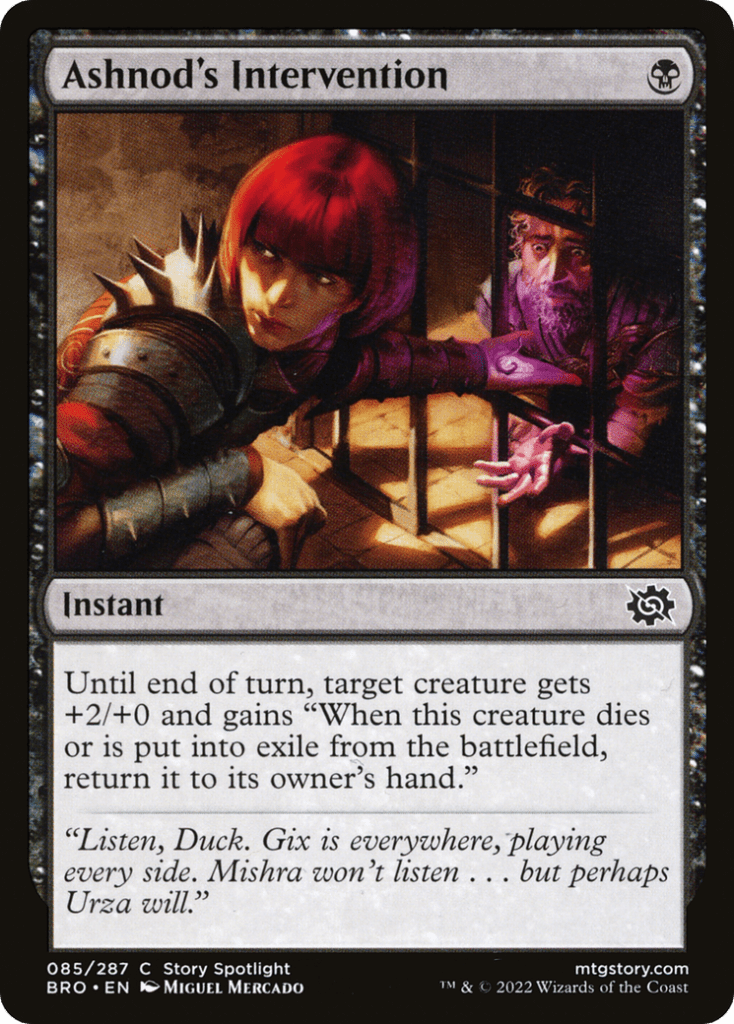 Ashnod’s Intervention is actually perfect for this because it also happens to give target creature a +2/+0 boost and it gives the creature the ability to come back into our hand whenever it dies or is put into exile from the battlefield, which is very helpful against exile based removal spells.