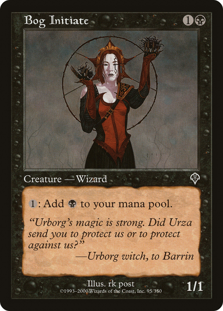 Bog Initiate is simple enough to understand, we pay 1 mana to make a black mana and that can seem like a far cry from a win condition. However, if we have been playing the deck correctly then we should have been making a good number of Powerstone tokens, which while they can’t be used to cast nonartifact spells, they can in fact be used to activate abilities of whatever we want, meaning we can feed that mana through Bog Initiate to have a ton of black mana.