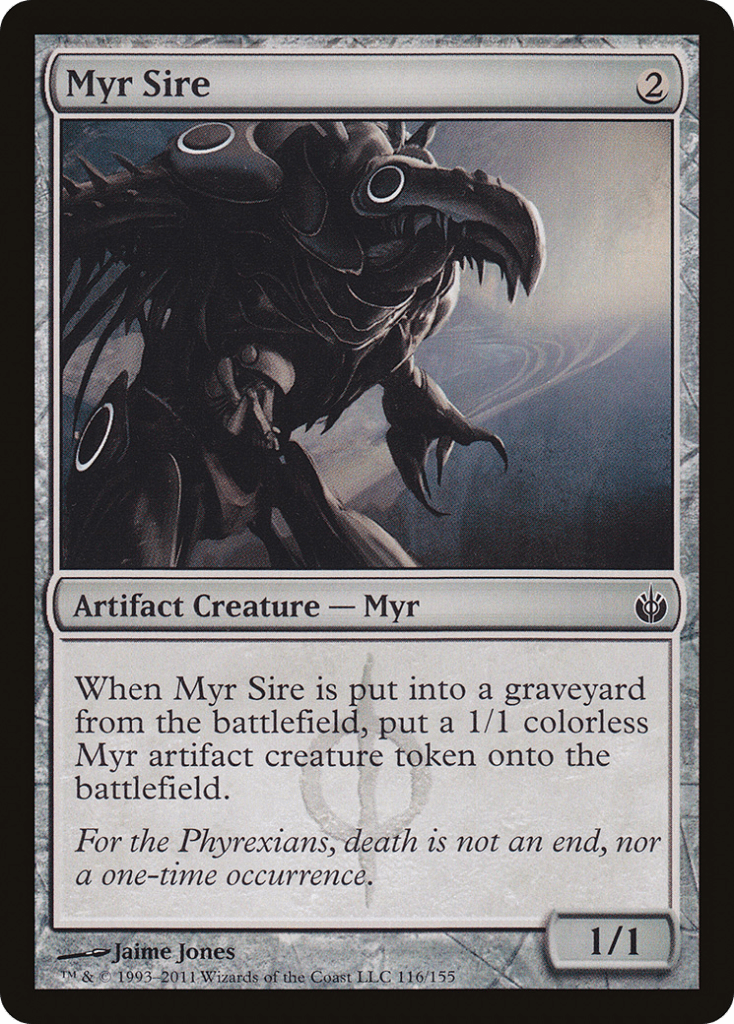 Additionally anything that can make an additional body for us to sacrifice is going to serve us really well, like Myr Sire because when it dies we can put a 1/1 Myr token onto the battlefield for us to sacrifice our next turn.