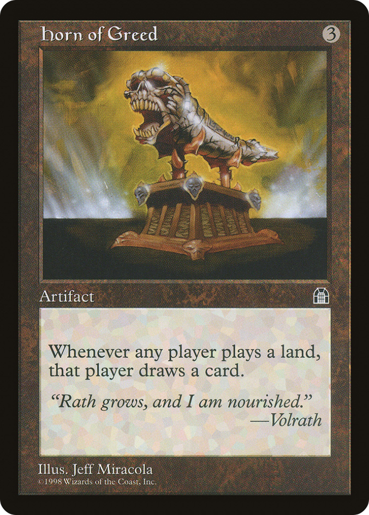 One is for us to effectively become a mill deck in the most roundabout way possible by using cards that have our opponents draw even more, and Horn of Greed is a great card for this because it has it so that whenever a player plays a land then that player draws a card.