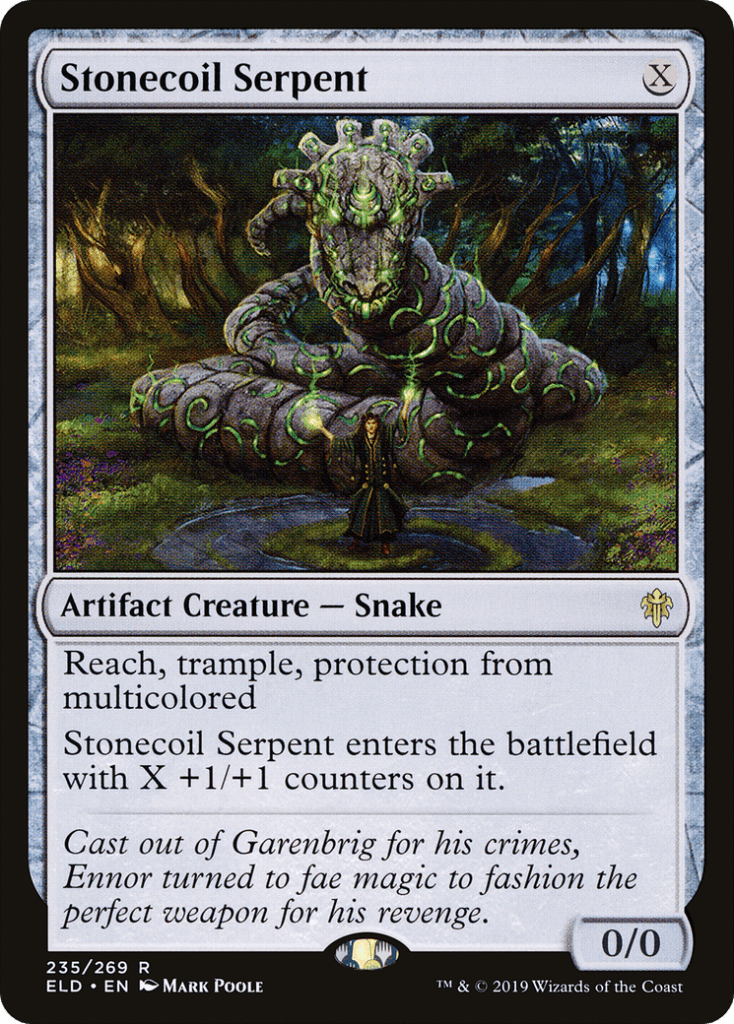 We can also gain benefit from all of this and more from all of the lands and mana we get with cards that have an X cost or cards that hose strategies that use more than one color like Stonecoil Serpent which does both since enters with X +1/+1 counters, has reach, trample, and protection from multicolored.