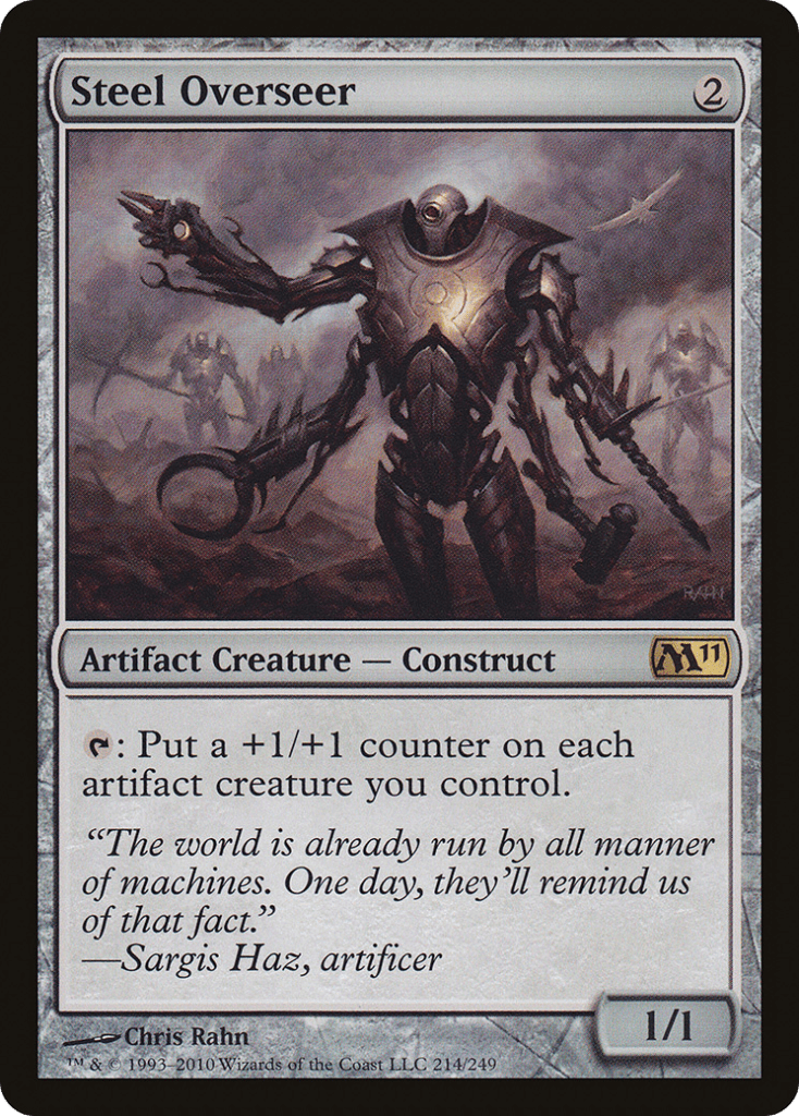 We can also have some creative ways to make The Regalia a bit more effective in combat with cards like Steel Overseer which can tap to put a +1/+1 counter on each artifact creature we control, which we can hold off until we Crew The Regalia in order to slowly grow it to deal more and more damage.
