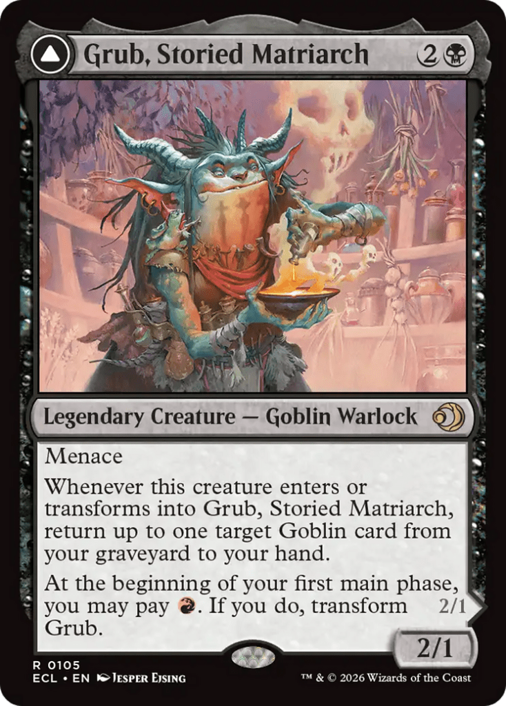 Grub is a three mana 2/1 with menace and whenever they enter or transform into the Grub, Storied Matriarch you return up to one Goblin card from your graveyard to your hand and at the beginning of your first main phase you may pay a red mana to transform into Grub, Notorious Auntie who is still a 2/1 with menace but whenever they attack you may blight 1, and if you do you create a tapped and attacking token of the blighted creature that sacrifices itself at the beginning of the end step and at the beginning of your first main phase you may pay a black mana to transform Grub.