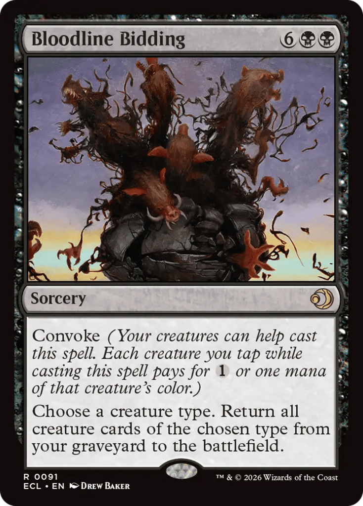 If we are leaning more to a sacrifice strategy and have a good number of Goblins in our graveyard and a decent number of creatures in play then we can also play Bloodline Bidding, which let’s us choose a creature type and then return all creature cards of the chosen type from our graveyard onto the battlefield.