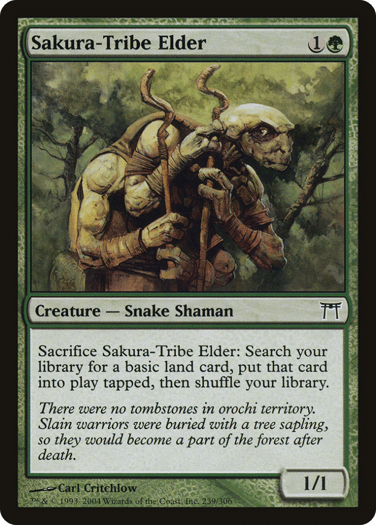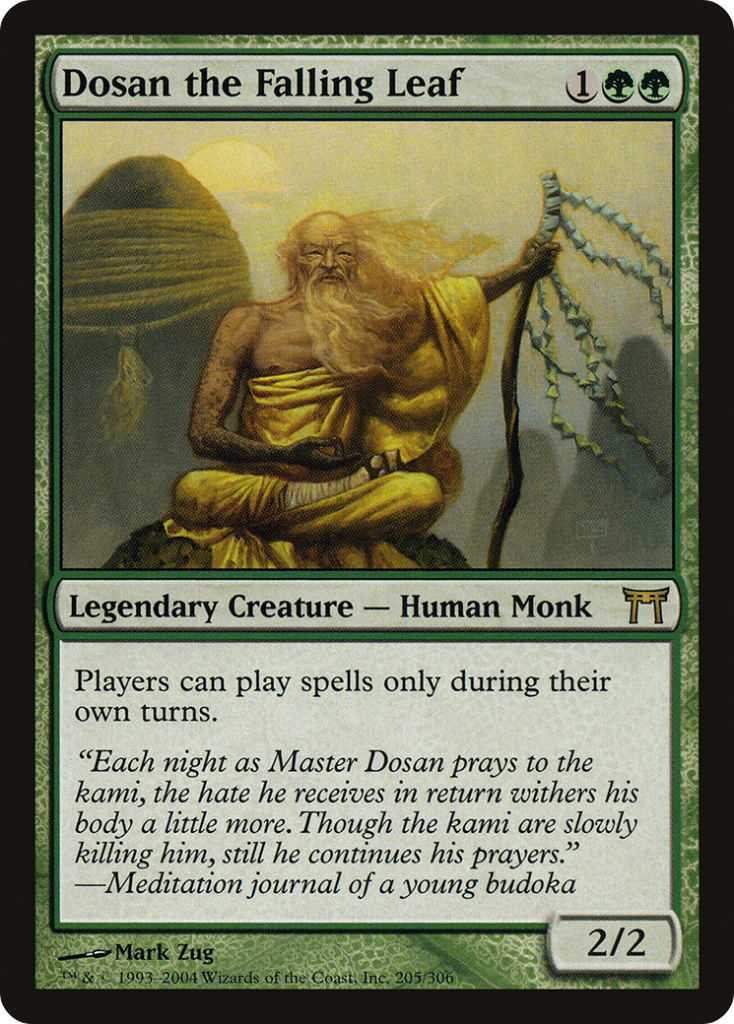 My picks for green are Dosan the Falling Leaf, Glimpse of Nature, Honden of Life’s Web, and Sakura-Tribe Elder.